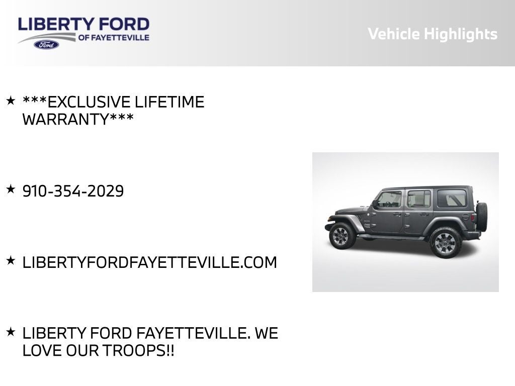 At Liberty Ford Fayetteville, we're proud to serve our local community, including our brave servicemembers. We love our troops, and we're ready to help you find the perfect vehicle to conquer the road ahead. Contact us today to schedule a test drive and discover the Jeep Wrangler Unlimited Sahara for yourself.
