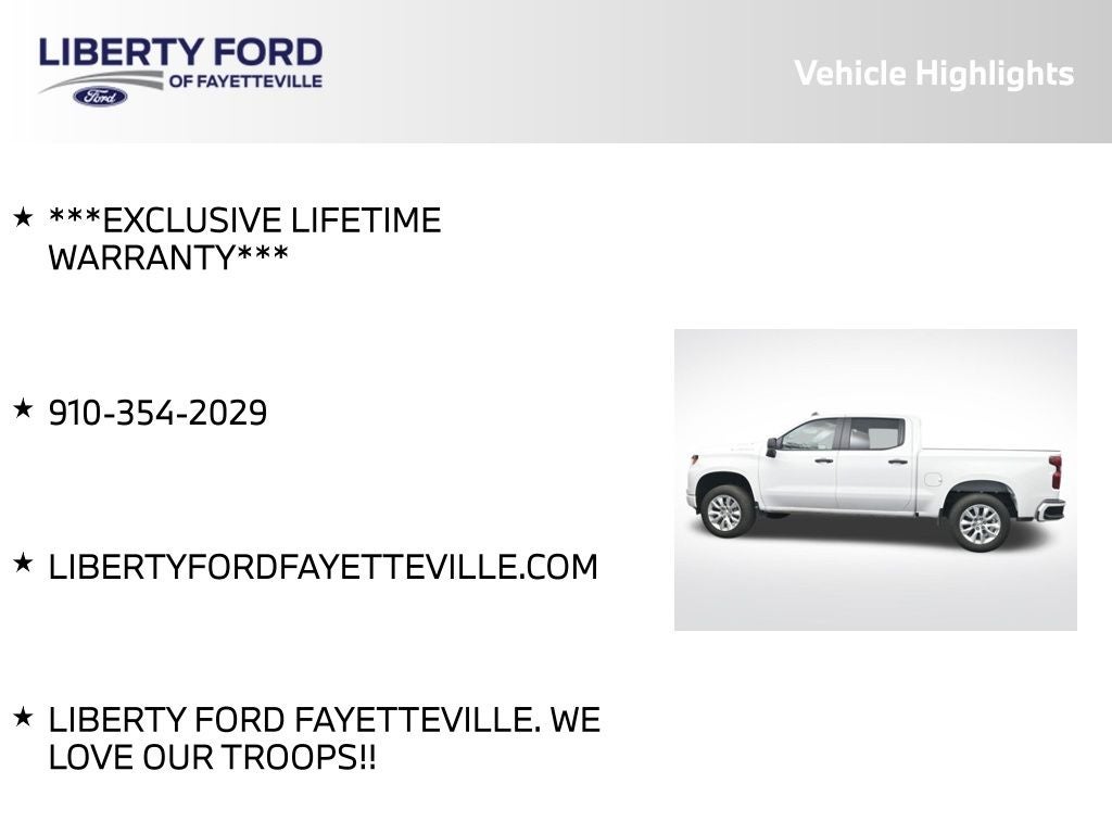 Don't miss your chance to own this exceptional Silverado. Contact us at 910-354-2029 or visit LIBERTYFORDFAYETTEVILLE.COM to schedule a test drive and learn more about our exclusive lifetime warranty. At Liberty Ford Fayetteville, we're proud to serve those who serve, and we're confident this Silverado will exceed your expectations.